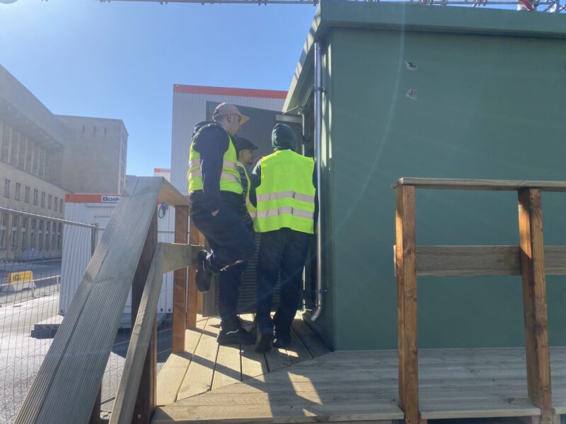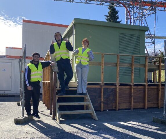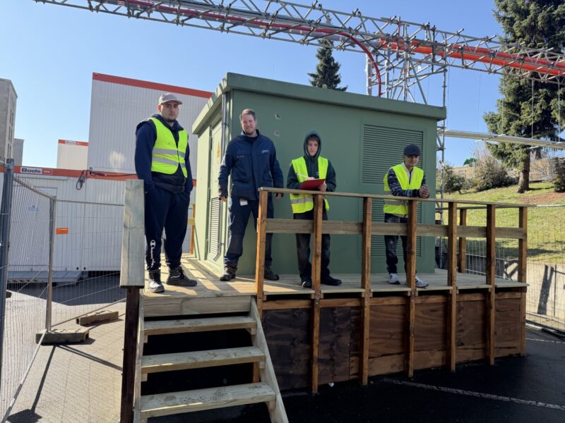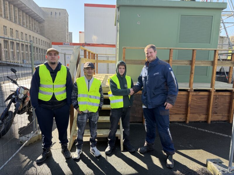 Nach einer kurzen Schneepause konnten die Arbeiten um die Transformator Station von Energie Berlin abgeschlossen werden. Ein Holzpodest mit Treppe ermöglicht jetzt den Zugang zur Station und verkleidet die Kabelstränge am Gebäude.