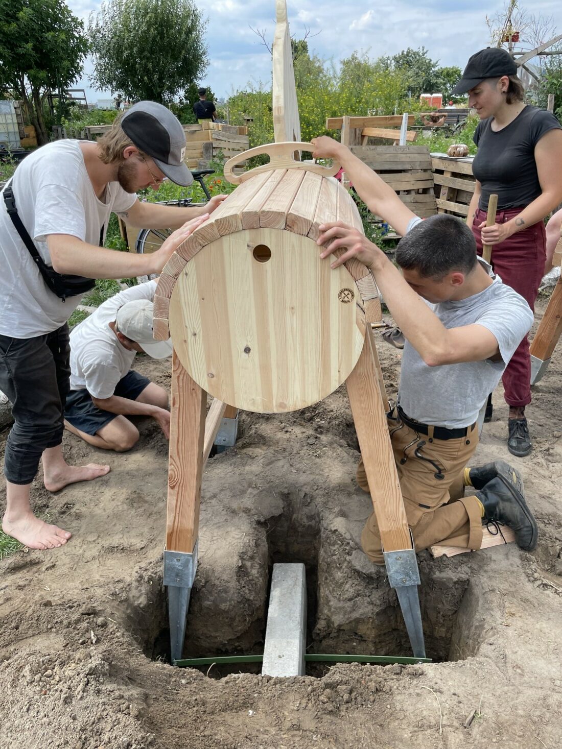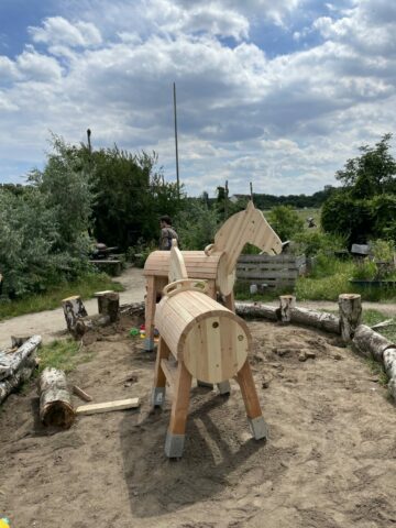 Mit Helfer*innen aus dem Verein sowie aus dem Quartier Schillerpromenade wurden die beiden Holzpferde im Garten auf dem Tempelhofer Feld aufgestellt und können ab sofort von Familien mit Kindern zum Spielen genutzt werden.